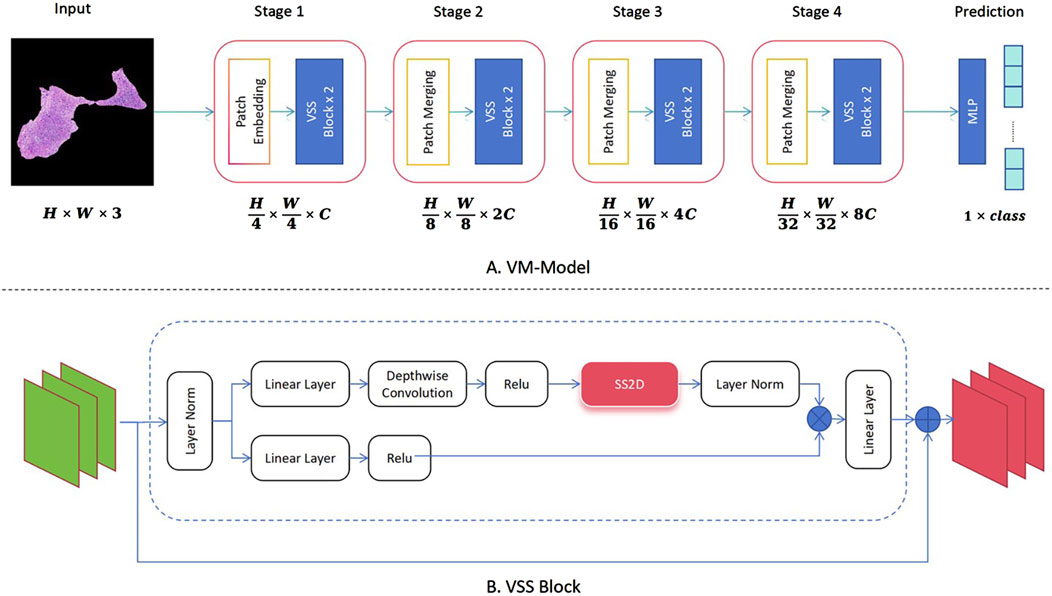 In this study, we implemented the cutting-edge DL model Mamba (13), using it across various domains, including classification and image segmentation. Within the realm of DL, frameworks such as CNNs (14–20) and ViT (21) have achieved remarkable outcomes. CNNs excel at processing local patterns and textural details, but struggle with capturing the broader context and long-range dependencies within images. On the other hand, the transformer architecture (22), particularly the ViT, has outperformed in numerous visual tasks, leveraging its prowess in handling long-distance dependencies and sequential data processing. However, ViT models usually require extensive datasets for training and are computationally expensive. In this study, we used the advanced ViM model as our core network architecture, which operates at 2.8 times the speed of contemporary ViT models while consuming approximately 86.8% less GPU memory, thus offering an efficient alternative that mitigates the heavy computational demands of traditional transformer models (23).