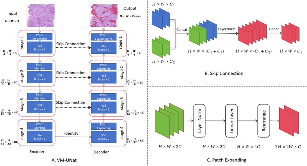 Figure 2. Use of the Vision Mamba UNet (ViM-UNet) as the image-based segmentation network. (A) The complete UNet structure is shown, including the encoder and decoder. (B) Diagram showing how the skip connection structure achieves feature fusion between the encoder and decoder. (C) Diagram showing how the patch expanding structure, actually implemented, achieves sampling and feature recovery.