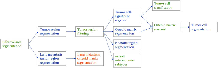 Results and Discussion: The model demonstrated Dice coefficient values of 0.83 or higher in tumor segmentation, osteosarcoma osteoid matrix segmentation, necrotic area segmentation, lung metastatic tumor segmentation, and lung metastatic osteoid matrix segmentation. For necrosis classification, overall osteosarcoma subtypes, and localized osteosarcoma subtypes, the area under the receiver operating characteristics curve (AUC), sensitivity, specificity, positive predictive value (PPV), and negative predictive value (NPV) all exceeded 90%. The proposed model exhibited excellent performance, indicating high potential for future clinical application in osteosarcoma patients. This framework shows promise for enhancing the precision and efficiency of pathological diagnosis and evaluation in osteosarcoma management.