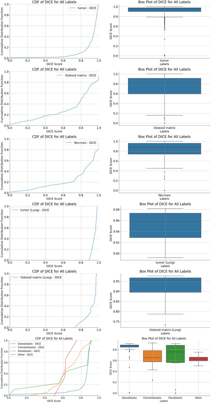 Figure 4. Cumulative distribution function (CDF) distribution of Dice coefficient values for various region segmentations. (A,B) tumor region segmentation; (C,D) osteoid matrix segmentation; (E,F) necrotic region segmentation; (G,H) pulmonary metastatic tumor segmentation; (I,J) pulmonary metastasis osteoid matrix segmentation; (K,L) tumor cell segmentation, along with boxplots of Dice coefficient scores for each algorithm.