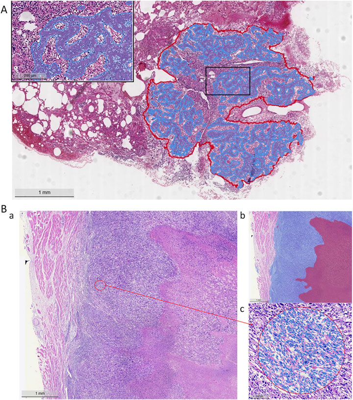 Figure 5. Model segmentation performance. (A) Lung metastasis tumor segmentation and osteoid matrix segmentation localization (red curve indicates the metastatic tumor area, blue curve indicates the osteoid matrix area). (B) Necrotic region segmentation and tumor cell identification (a: H&E staining image, b: blue area on the left indicates tumor cells, red area on the right indicates necrosis, c: tumor cell identification).