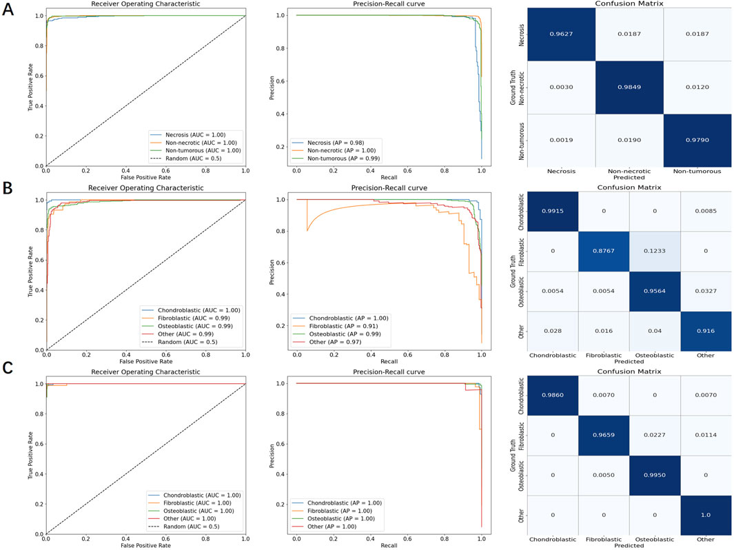 Figure 6. PR curves, ROC curves, and confusion matrices for necrosis classification, overall osteosarcoma subtypes, and localized osteosarcoma subtypes, respectively. (A) necrosis classification; (B) overall osteosarcoma subtypes; (C) localized osteosarcoma subtypes.