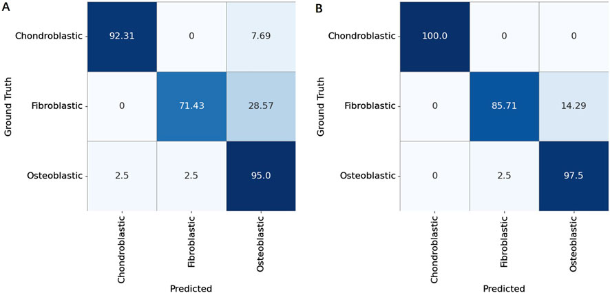 Figure 7. Confusion matrices for patient-level classification of osteosarcoma subtypes (Chondroblastic, Fibroblastic, and Osteoblastic) using two aggregation strategies. (A) Results obtained by aggregating tile-level predictions based on the overall area proportion of each subtype within a patient’s whole slide image. (B) Results obtained by aggregating tile-level predictions based on the local block count (majority voting of subdivided regions).