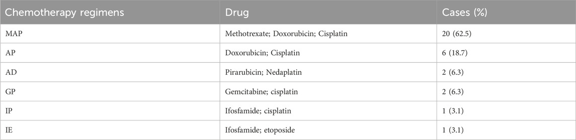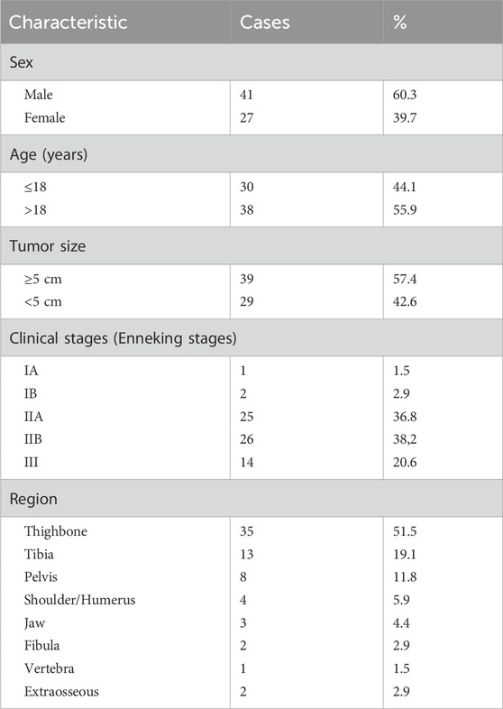 The clinical characteristics of 68 osteosarcoma patients are shown in Table 1, among whom 32 patients received preoperative chemotherapy. The chemotherapy regimens are summarized in Table 2. The inclusion and exclusion criteria for tissue slides were as follows: