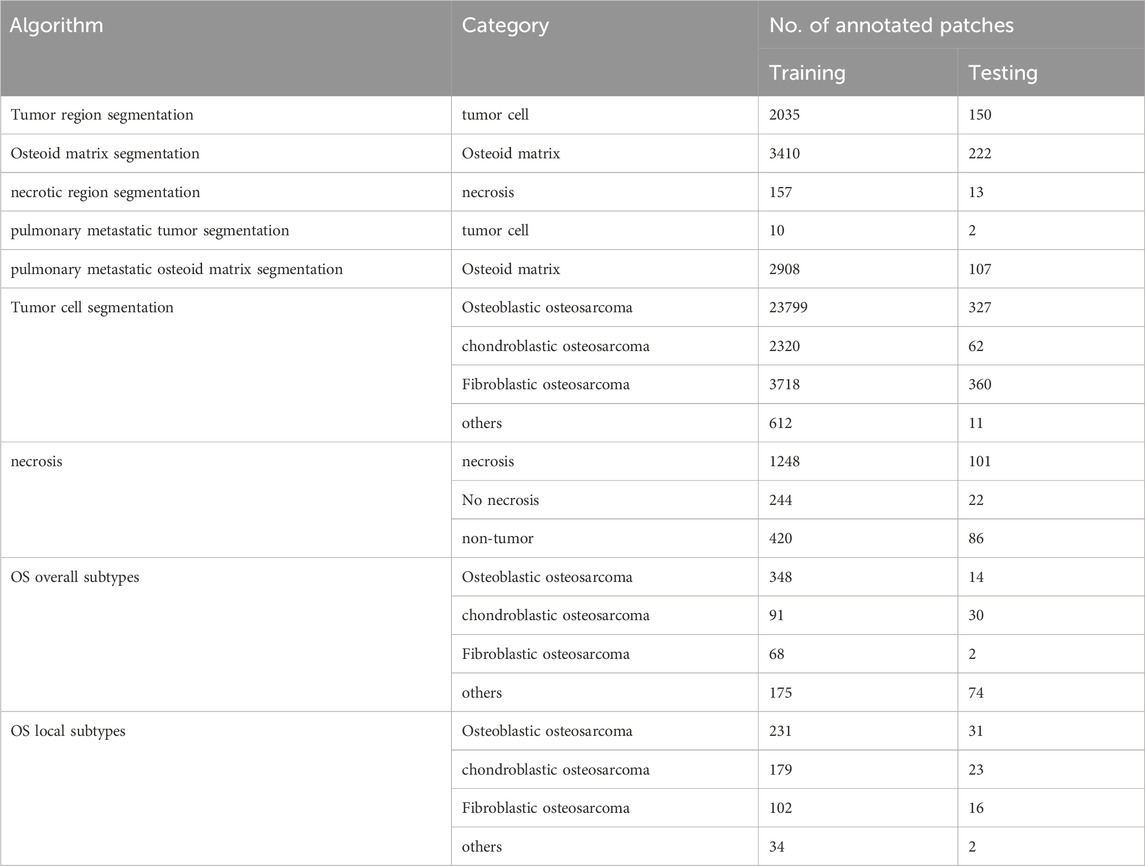 From the Chongqing General Hospital, we collected data from 68 osteosarcoma patients, including 40 cases of osteoblastic osteosarcoma, 13 cases of chondroblastic osteosarcoma, 7 cases of fibroblastic osteosarcoma, and 8 cases of other rare osteosarcoma subtypes. In total, we obtained 128 whole slide images (WSIs) stained with hematoxylin and eosin (H&E) staining, including 9 lung metastasis samples. The data statistics used in each cascaded algorithm are provided in Table 3. For example, in the tumor region segmentation algorithm, the training set included annotations for 2,035 tumors, while the test set had annotations for 150 tumors. Similarly, in the tumor cell segmentation algorithm, four types of cells were labeled: osteoblastic, chondroblastic, fibroblastic, and other cells. Osteoblastic cells were the most prevalent, with 23,799 labeled training targets and 327 test targets. For necrosis classification, the training set contained 1,248 non-necrotic samples and 244 necrotic samples, while the test set included 101 non-necrotic and 22 necrotic samples. More detailed statistics are given in Table 3.