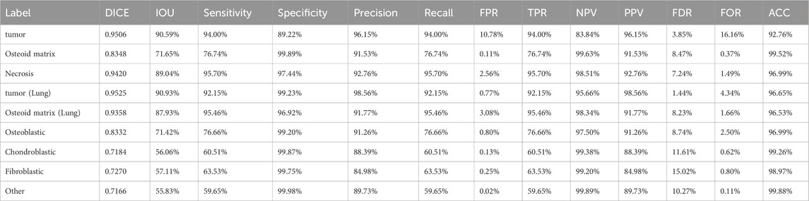 Table 4. Detailed values for tumor segmentation, osteosarcoma osseous matrix segmentation, necrotic area segmentation, lung metastasis tumor segmentation, lung metastasis osseous matrix segmentation, and tumor cell segmentation.
