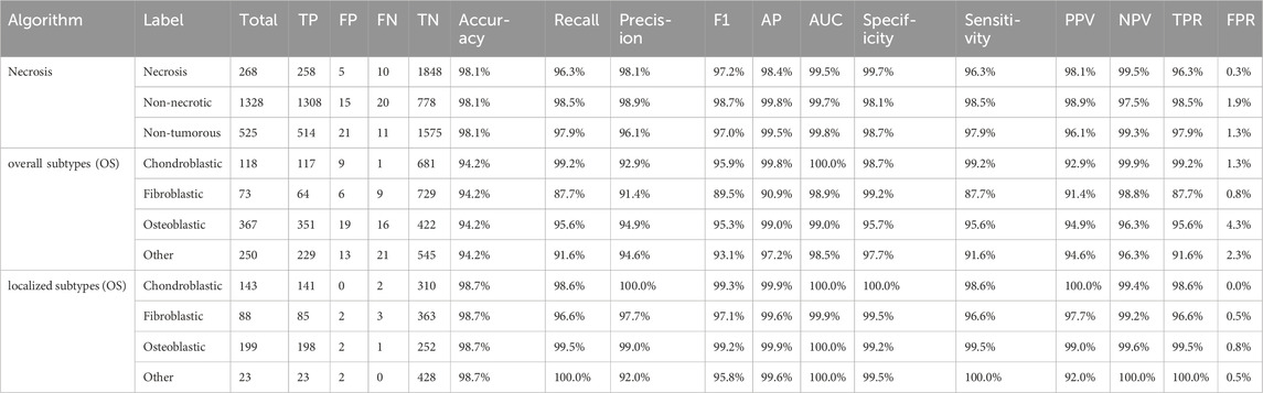 Table 5. FP, FN, AUC, sensitivity, specificity, PPV, and NPV values for necrosis classification, overall osteosarcoma subtypes, and localized osteosarcoma subtypes.