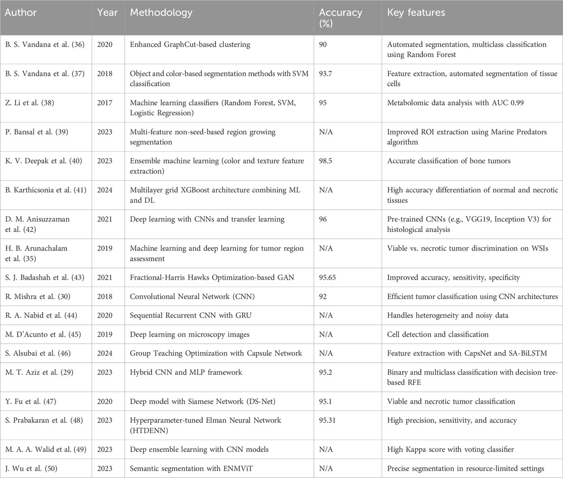 The use of artificial intelligence (AI) has revolutionized osteosarcoma research, with both traditional machine learning and DL techniques achieving significant advancements. For instance, traditional methods, such as random forest (RF) and support vector machines (SVMs) have demonstrated promising accuracy in classifying osteosarcoma based on metabolomic and histopathological data (26, 28). In addition, DL models, including convolutional neural networks (CNNs) and generative adversarial networks (GANs), have shown exceptional performance in tumor classification and segmentation, achieving detection accuracies as high as 96% (32, 40). Additionally, frameworks such as UNet [53] and Deeplab [57] have further enhanced segmentation precision, even with limited datasets.