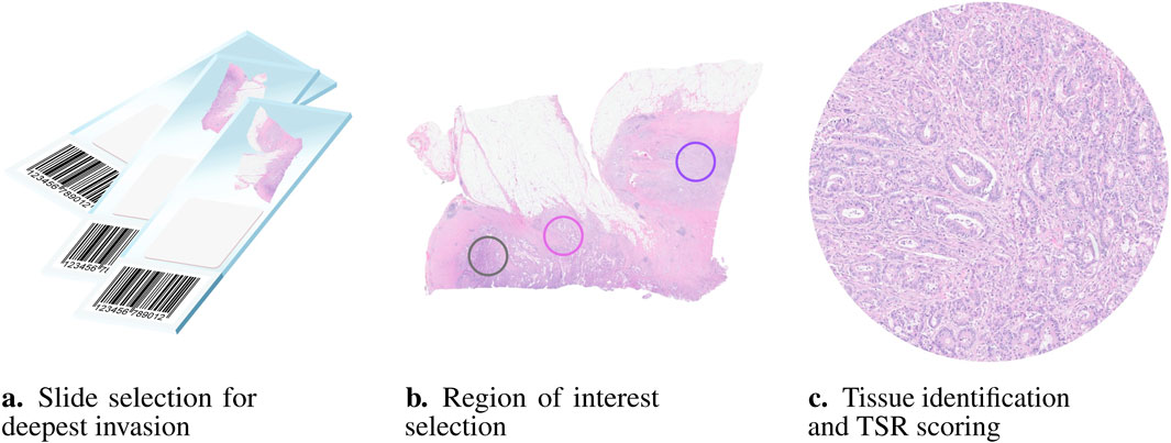 Figure 2. Visual representation of the pipeline used in clinical practice to manually evaluate the TSR. According to van Pelt’s 2018 recommendations (9) the first step (a) is selecting the slide to be scored, containing the most invasive part of the tumour. Next, (b) the region of interest (ROI) with the highest perceived amount of stroma is selected. Notably, tumour cells must be present at all four borders of the image field. Only one ROI is necessary, but selecting the most representative area can be challenging as multiple suitable regions may be available. Finally, (c) TSR is calculated after assessing the tissue types within the ROI. Lumina, necrosis, and mucin should be visually ignored for scoring, if present.