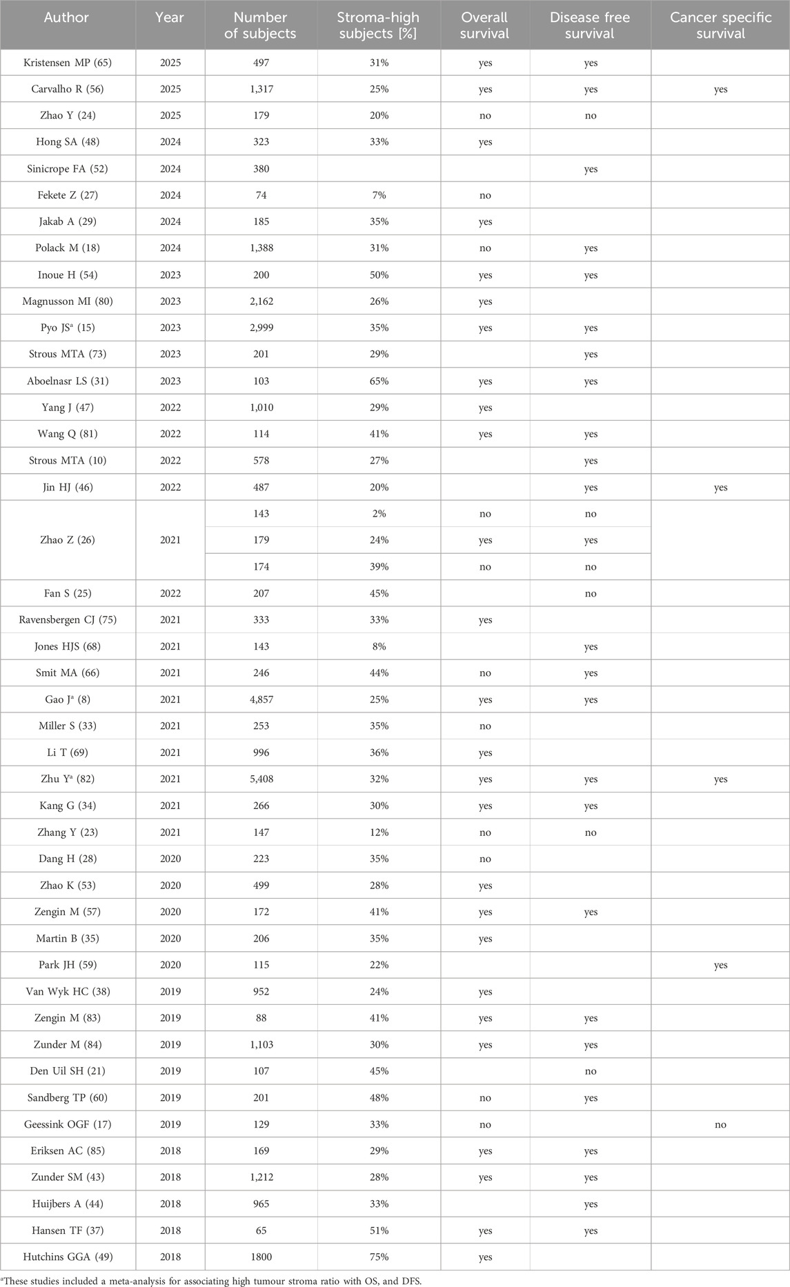 The correlation between TSR and DFS and OS was generally found to be significant. Twenty-nine studies have analysed DFS as primary or secondary outcome and 25 of these, including three meta-analyses, demonstrated a significantly worse prognosis for patients with high stroma content, as seen in Table 1. Five studies did not report a significant association with TSR (21,23–26). The association between TSR and OS followed an equivalent trend. Among the 35 studies investigating OS, 26 studies, including the aforementioned meta-analyses, demonstrated a significantly higher mortality risk in patients with high stroma content. Additionally, ten studies, including the recent prospective multicentre UNITED study, did not reach statistical significance but still reported a trend towards worse prognosis in high-stroma tumours (18). It should be noted that the UNITED study was specifically powered for 3-year DFS with a 5-year OS as a secondary outcome. Three articles did not find a trend of worse prognosis with high stroma. These studies had a dataset with a very low amount of stroma-high subjects, or investigated only stage I or IV subjects (26–28).