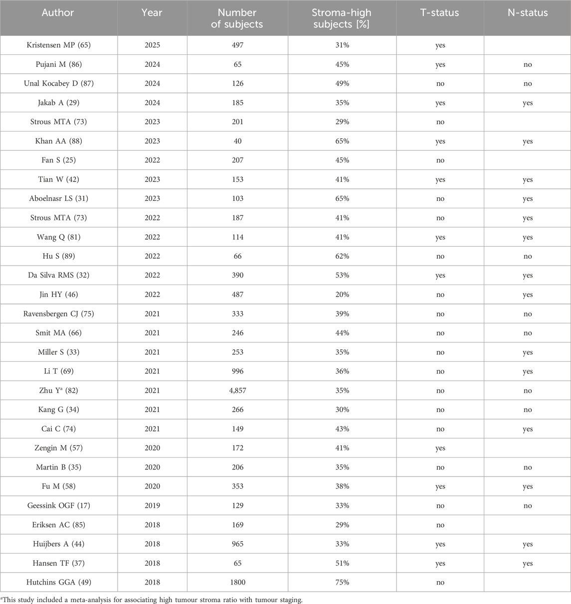 Table 2. Studies investigating the association of stroma high lesions with increased T-status and positive N-status. Significant correlations are denoted with “yes”, and non-significant correlations are denoted with “no”.