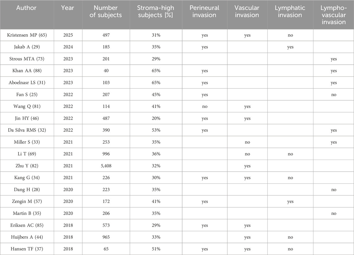 Table 3. Studies that investigated the association of stroma content in lesions with invasion of local microstructures. If a higher stroma content is significantly related to a higher invasion rate, this is denoted with “yes”. If this relation is not found it is denoted with “no”.