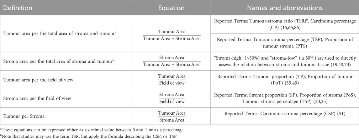 A variety of definitions for stromal content are reported in the literature. Numerous studies denominating their stroma evaluation as “TSR”, make use of different definitions and formulas. These methodological variations are summarised in Table 4.