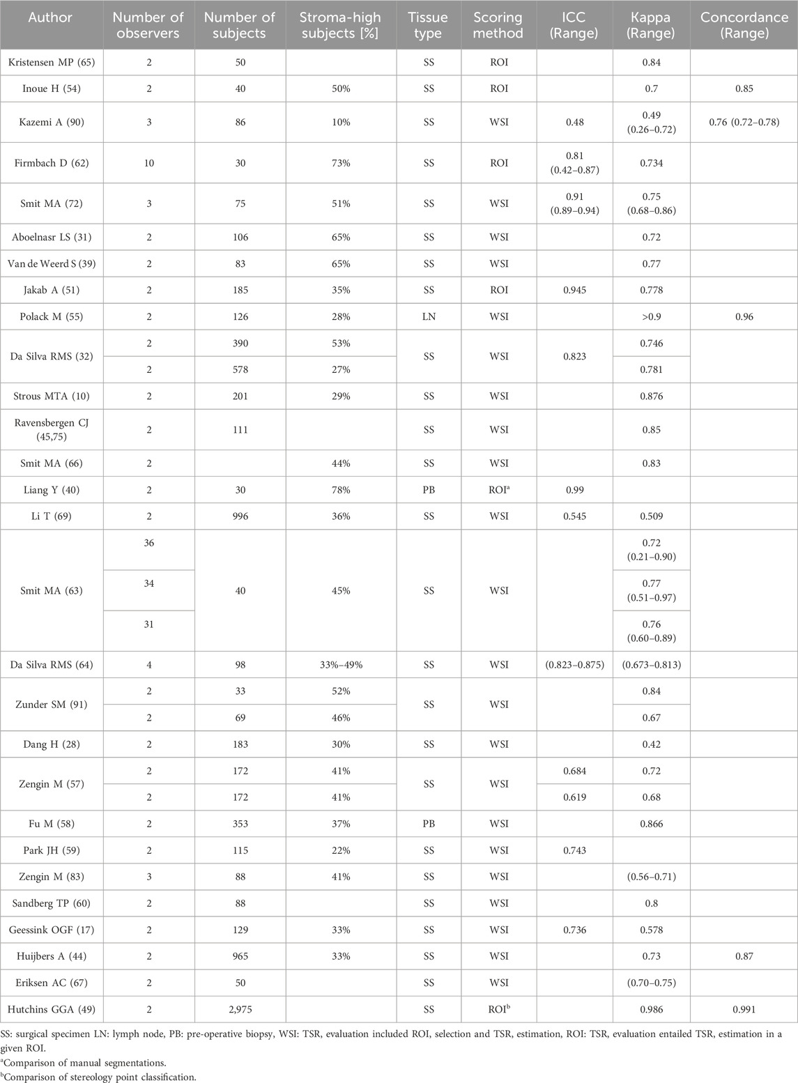 The median percentage of stroma-high subjects of all included papers is 37.3% ranging from 2.1% to 85.9%. This is concordant with the mean percentage of stroma-high subjects identified in the meta-analysis by Pyo et al. of 35.3% (15). The wide reported TSR range can be attributed to the inclusion and exclusion criteria of the study subjects, TSR scoring protocol, and interobserver variability. Though the reported Kappa scores indicate a moderate to substantial agreement, this should not be confused with discrepancies being acceptable for clinical adoption, Table 6. In the study by Souza da Silva et al., though the Kappa score of 0.746 indicates a substantial agreement, large discrepancies in the classification were observed. A senior pathologist classified 32.7% of samples as stroma-high whereas the baseline pathologist classified 44.9% of subjects as such, which is an increase of 37%. This shows that while Kappa can suggest substantial agreement, clinically relevant discrepancies can still occur.