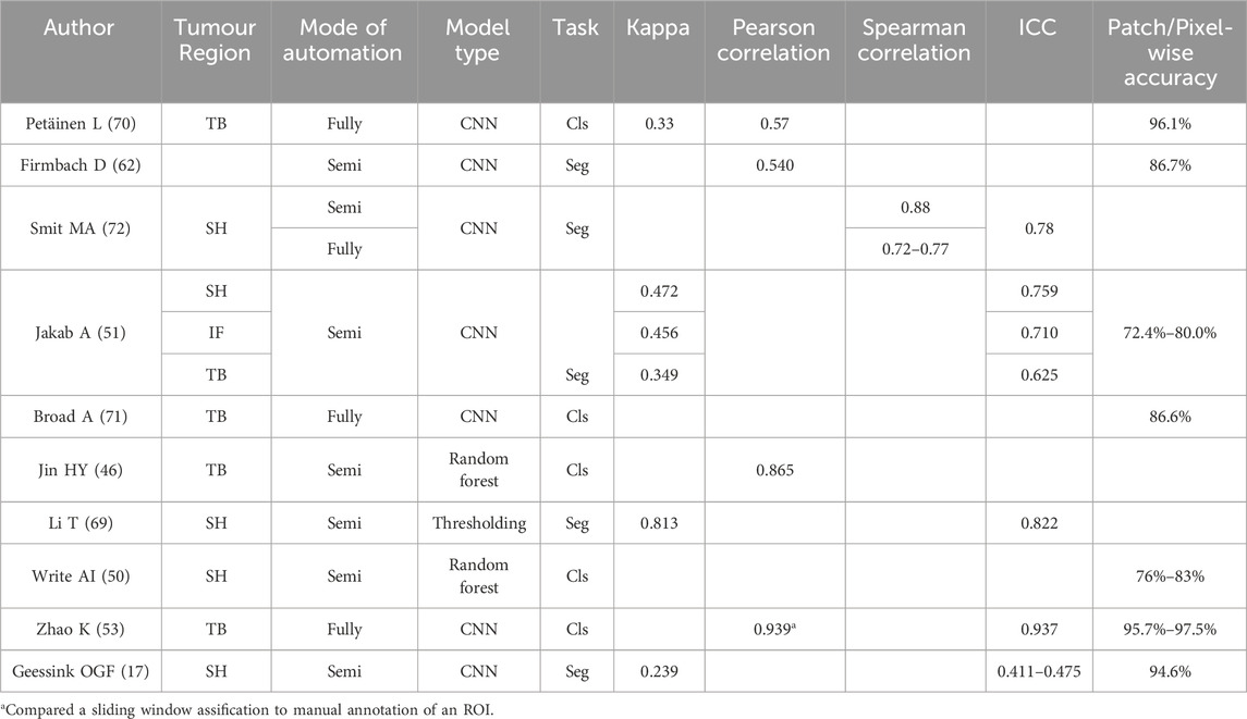 Table 7. Studies which provided the comparison between their automated quantification approach and the manual counterpart. The “Stroma hotspot” refers to the region with the highest perceived stroma as defined by Van Pelt et al. (9) TB: Tumour bulk, SH: Stroma hotspot, IF: Infiltrative edge, Cls: classification task, Seg: segmentation task.