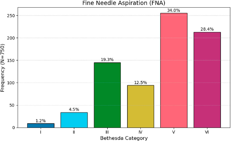 Preoperative fine-needle aspiration cytology (FNA) of the thyroid nodule yielded suspicious or malignant cytological findings in 62.4% of cases (Table 1; Figure 1).