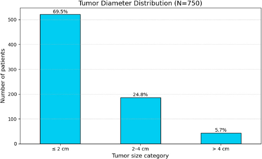 Figure 2. Frequency distribution of tumor size categories (diameter in cm) in 750 patients.