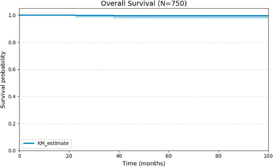 Figure 3. Kaplan-Meier curve for Overall Survival (OS) of the cohort of 750 patients over 100 months of follow-up.