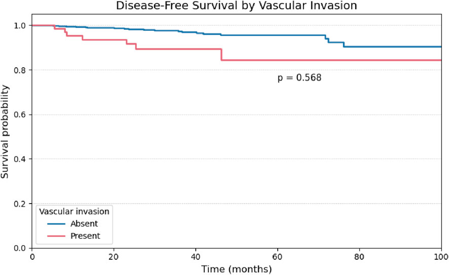 A univariate analysis was performed for the remaining binary histopathological variables. The presence of vascular and perineural invasion demonstrated comparable behavior, with no statistically significant impact on disease-free survival (Figures 4, 5).