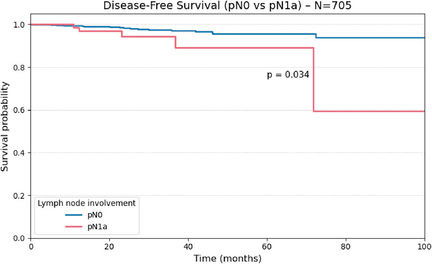 Figure 7. Kaplan-Meier curve for Disease-Free Survival comparing patients with central lymph node involvement (pN1a) versus absence of lymph node involvement (pN0) (N = 705).