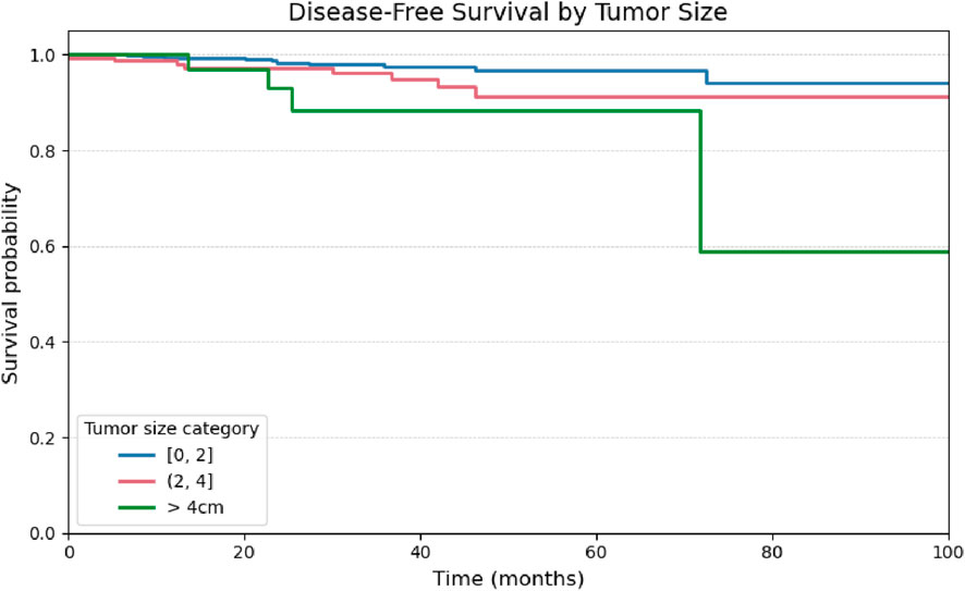 Figure 9. Kaplan-Meier curve for Disease-Free Survival stratified by tumor size categories (≤ 2 cm, >2 to 4 cm, > 4 cm).