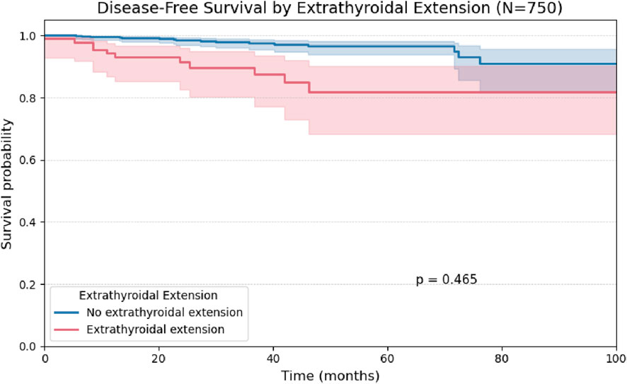 Although Kaplan-Meier analysis using the log-rank test did not demonstrate a statistically significant difference in disease-free survival based on the presence of extrathyroidal extension (p = 0.40; Figure 9), this variable remained the strongest predictor of recurrence in Cox regression analysis, with a hazard ratio of 4.94 in the univariate model and 3.21 in the multivariate model (Table 4). This discrepancy may be explained by methodological differences between the tests: while the log-rank test evaluates global survival curve differences, the Cox model estimates the continuous effect of each covariate on recurrence risk over time, and is often more sensitive in analyses involving low event rates (6).