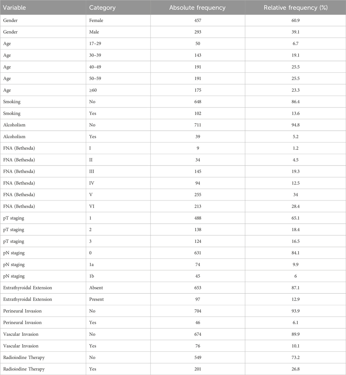 Histopathological characteristics of the surgical specimens were assessed. All selected patients were diagnosed with papillary thyroid carcinoma. According to the eighth edition of the AJCC TNM classification, 488 patients (65.1%) were classified as pT1. The distribution for pT2 and pT3 was 18.4% and 16.5%, respectively.