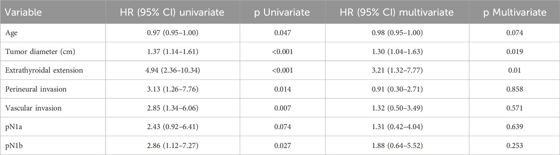 After adjustment in the multivariable Cox proportional hazards model, only tumor diameter (HR: 1.30; 95% CI: 1.04–1.63; p = 0.019) and extrathyroidal extension (HR: 3.21; 95% CI: 1.32–7.77; p = 0.010) remained as independent predictors of structural recurrence.