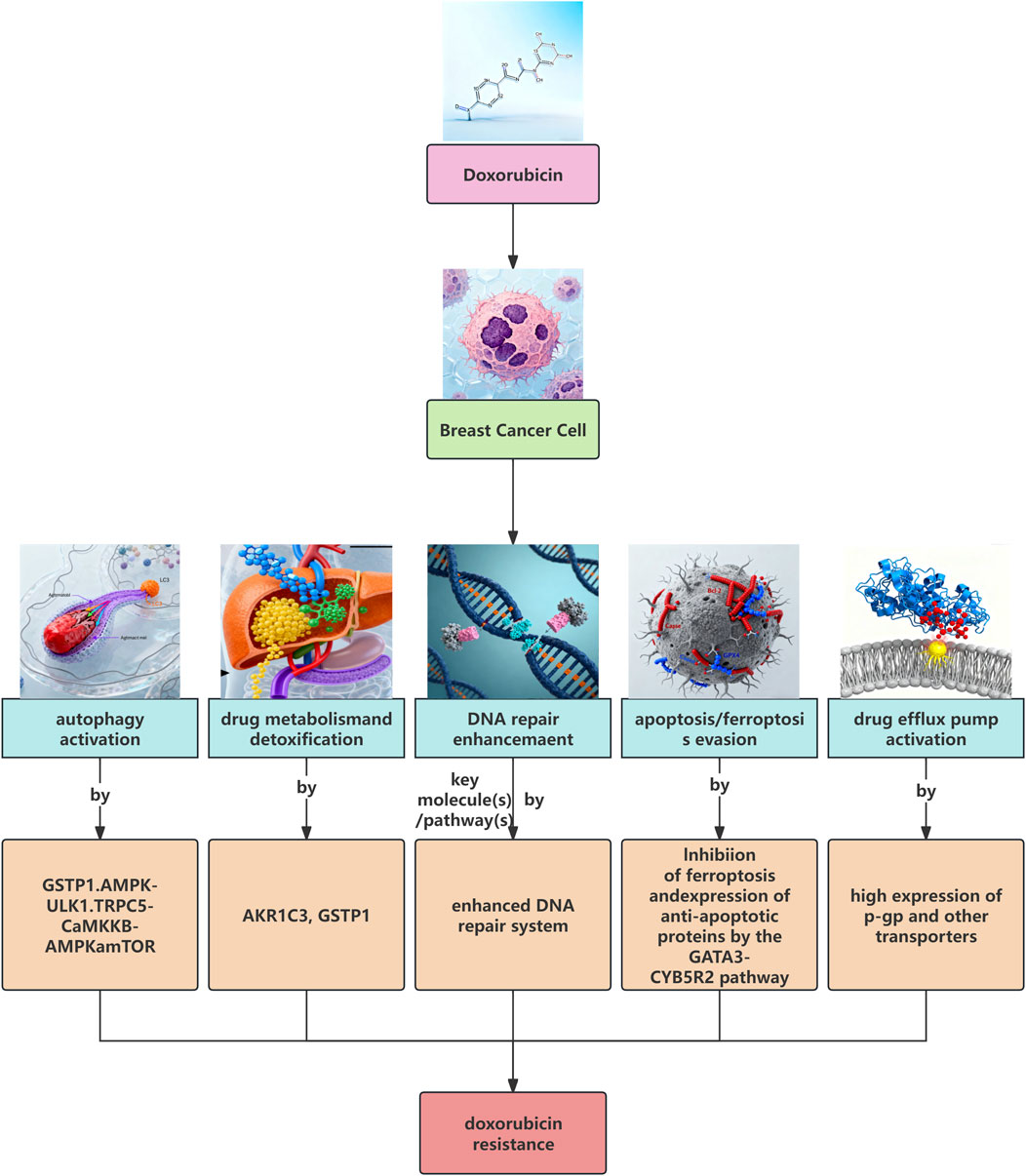 ADM resistance in breast cancer is the primary obstacle limiting the efficacy of chemotherapy and improving patient prognosis. Elucidating its complex molecular mechanisms is crucial for developing effective strategies to reverse drug resistance. Literature reviews indicate that ADM resistance in breast cancer involves multiple mechanisms, among which increased drug efflux and inhibition of apoptosis are classic mechanisms. Autophagy, as a stress - adaptive response, is exploited by tumor cells to resist chemotherapy drugs in many cases and plays a protective role (1,4,6–12). Multiple signaling pathways (such as CaMKKβ/AMPKα/mTOR, FGFR2/AMPKα (4,13–15,53–55) LK1, PI3K/AKT) and molecules (such as TRPC5, GSDMB, ncRNAs) have been found to be involved in regulating autophagy and influencing breast cancer drug resistance (17–25,27,28,81). Meanwhile, the Wnt/β - catenin signaling pathway also plays an important role in the occurrence, development, and drug resistance of breast cancer. It promotes drug resistance through multiple mechanisms such as affecting drug efflux, cancer stem cell characteristics, EMT, and apoptosis, and may have cross - regulation with autophagy undefined.