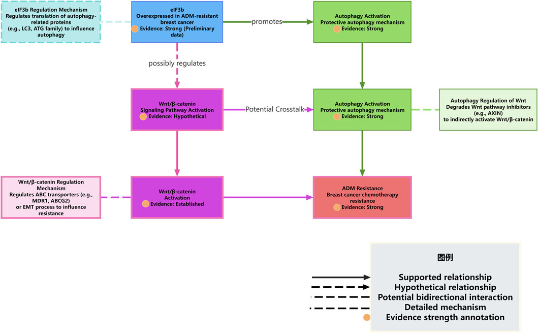The preliminary experimental results of this project have for the first time linked eIF3b to ADM resistance and autophagy in breast cancer. It was found that eIF3b is highly expressed in ADM-resistant breast cancer cells, and downregulation of eIF3b can inhibit autophagy and increase the sensitivity of cells to ADM. These preliminary evidences strongly suggest that eIF3b plays a key role in ADM resistance in breast cancer cells, and its mechanism appears to involve the regulation of protective autophagy, at least in the studied model. Our preliminary results also hint at a potential, though uncharacterized, association with the Wnt/β-catenin signaling pathway, but this connection remains speculative and is not directly supported by our current data, there is a lack of detailed mechanistic studies in the current literature on how eIF3b specifically regulates autophagy and the interaction between eIF3b and the Wnt/β-catenin signaling pathway in ADM resistance of breast cancer. This constitutes a gap in the current research field.