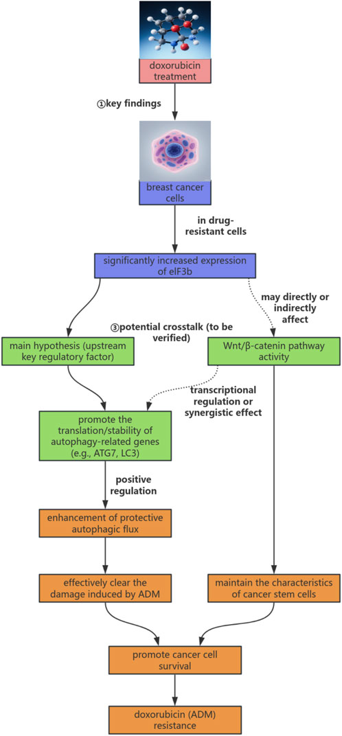 Based on the aforementioned literature and our preliminary results, we propose that eIF3b may regulate ADM resistance through autophagy. Notably, eIF3b has been experimentally shown to influence chemoresistance in breast cancer, which strengthens our hypothesis that it may also modulate protective autophagy (Figure 2). We can construct a potential mechanism model regarding how eIF3b regulates ADM resistance in breast cancer cells through autophagy and explore the possible ways in which the Wnt/β-catenin signaling pathway may be involved. Although our preliminary data are derived from MCF7/ARD cells, emerging evidence suggests that eIF3b may regulate autophagy and Wnt signaling in other breast cancer cell lines, including MDA-MB-468 and T47D cells (71).