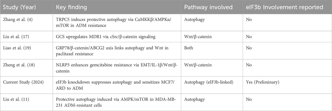 Table 1. Key studies linking autophagy and Wnt/β-catenin signaling to ADM resistance in breast cancer.