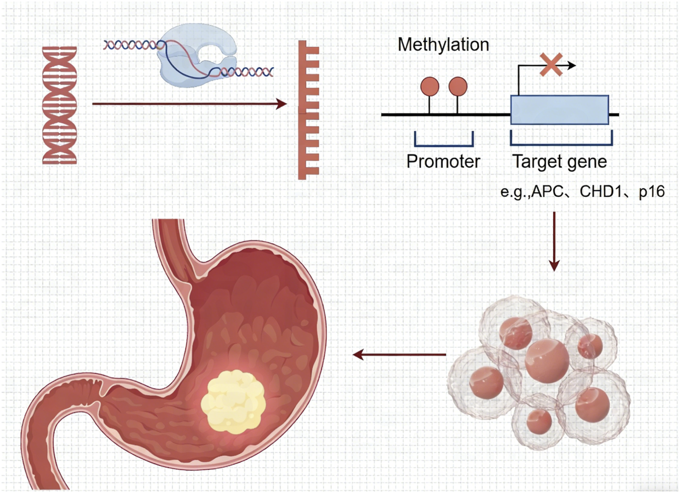 Promoter DNA methylation leads to gene suppression, contributing to the pathogenesis of gastric cancer.