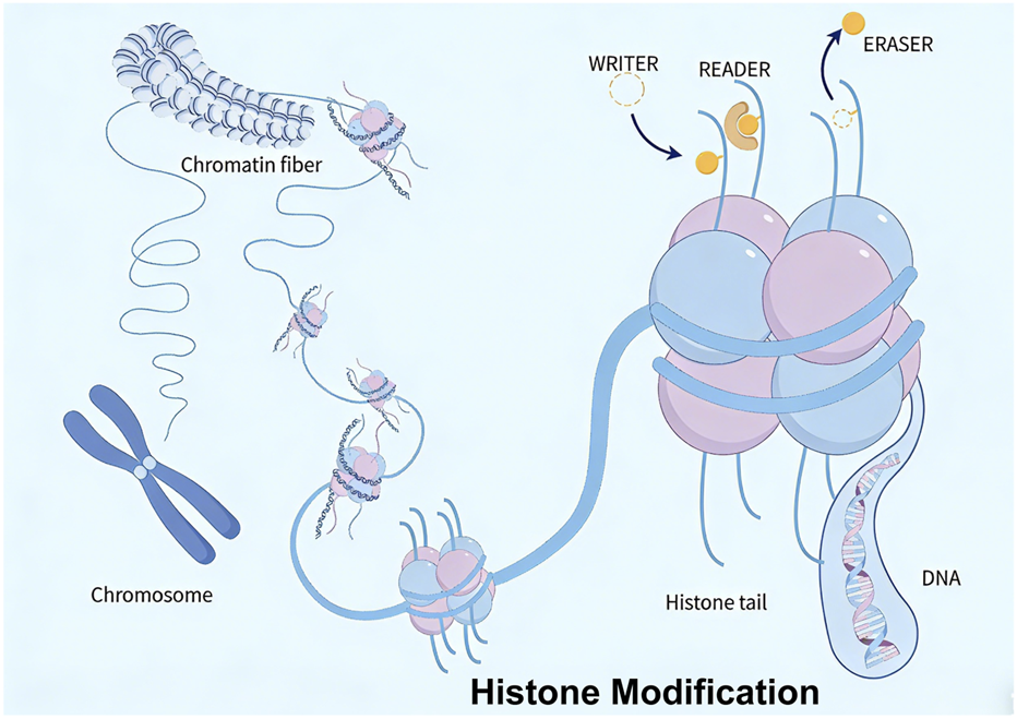 Epigenetic mechanisms of histone modification: acetylation, methylation, lactylation, phosphorylation, and ubiquitination.