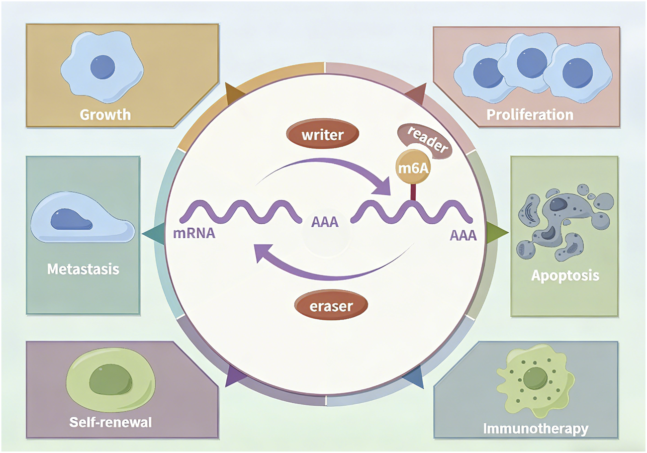 The m7G modification, driven by the METTL1/WDR4 complex, promotes GC progression through enhancing oncogenic tRNA expression and facilitating the translation of oxidative phosphorylation-related genes, thereby accelerating metabolic reprogramming (84). Clinically, prognostic signatures based on m7G-associated lncRNAs show significant value in predicting patient survival and immunotherapy response (85, 86). Similarly, m5C modifications mediated by writers such as NSUN2 contribute to gastric carcinogenesis, with PTEN mRNA m5C modification playing a key role in progression (87). Elevated m5C levels enhance tumor cell invasiveness, highlighting its potential as a therapeutic target (88, 89).