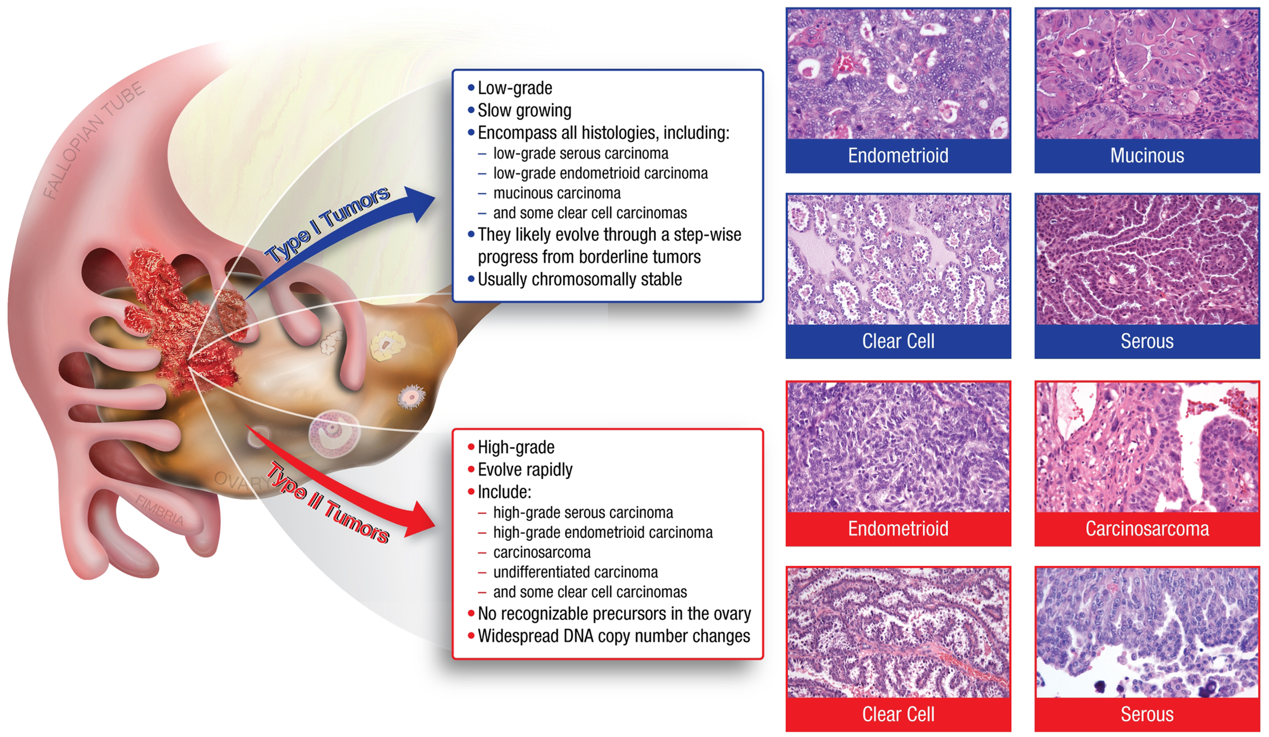 Figure 1. The major histologic subtypes of ovarian cancer fall into two subclassifications. Type I tumors are low-grade, slow growing carcinomas that typically arise from well recognized precursors lesions (borderline tumors) that themselves develop from the ovarian surface epithelium, inclusion cysts, or endometriosis. In contrast, Type II tumors are high-grade and rapidly growing carcinomas. Typically, they have spread well beyond the ovary at the time of diagnosis.