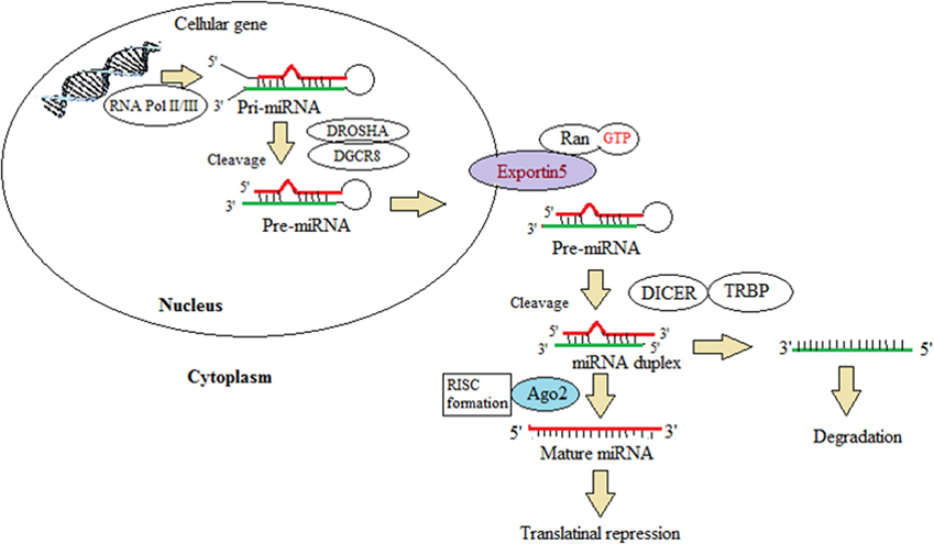 Figure 2. This illustration depicts the miRNA biogenesis. This represents the canonical maturation where primary miRNA transcripts (pre-miRNAs) are generated by RNA polymerase II or III and cleavage of the pre-miRNAs by the microprocessor complex Drosha–DGCR8 (Pasha) in the nucleus. The pre-miRNAs exit from the nucleus to the cytoplasm by exportin 5 (XPO5). In the cytoplasm, it is further processed by DICER1, a ribonuclease III (RIII) enzyme, that gives rise to the mature miRNAs. One strand of the mature miRNA (the guide strand) is loaded into the miRNA-induced silencing complex (miRISC) comprising DICER1 and Argonaute (AGO) proteins. The binding of miRNA to target mRNAs is facilitated by sequence complementary binding, leading to translational repression. This schematic diagram is modified from Lin and Gregory (42).