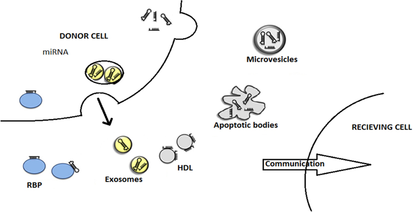 Figure 3. This figure describes the modes of miRNA export to neighboring cells. The miRNAs are being exported out of the donor cells with the help of various carriers, membrane-derived vesicles (exosomes, microvesicles, apoptotic bodies), miRNA-binding protein complexes (RBPs), or high-density lipoproteins (HDL). Finally, miRNAs entered to recipient cells where they are engaged in gene expression alterations. This illustration is modified from Thery (55) and Crescitelli et al. (53).
