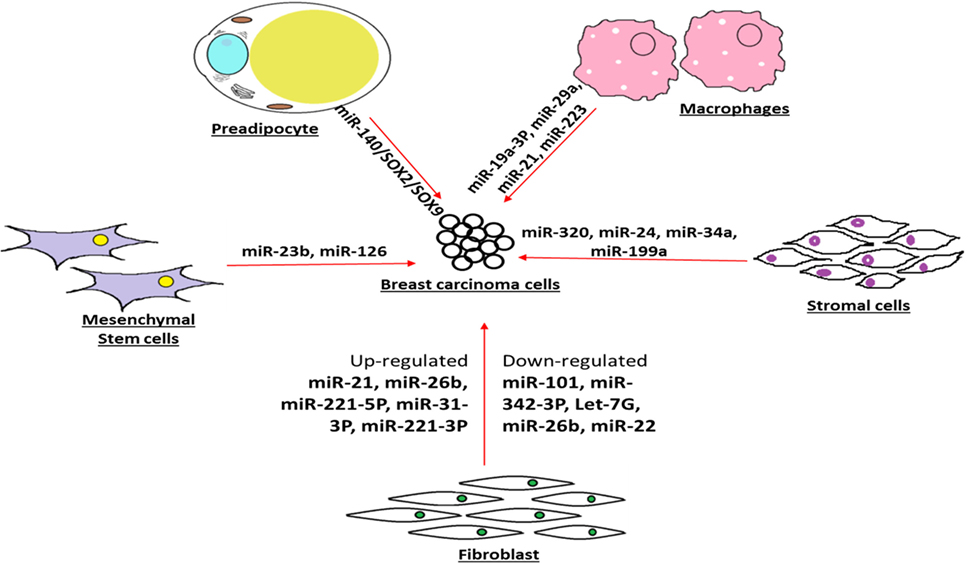 There is growing view that the cancer-associated fibroblasts and normal fibroblasts being in the neighborhood of breast tumor act differently with the first responsible for inducing breast tumor progression and second engaged in tumor blockade. In this context, about 11 dysregulated miRNAs in cancer-associated fibroblasts have been pinpointed that include three upregulated (miRNA-221-5p, miRNA-31-3p, and miRNA-221-3p) and eight downregulated (miRNA-205, miRNA-200b, miRNA-200c, miRNA-141, miRNA-101, miRNA-342-3p, let-7g, and miRNA-26b) (84). Furthermore, such observation accentuates the notion that miRNAs derived from breast tumor neighboring cells may influence the status of breast tumor through cell–cell communication (85).
