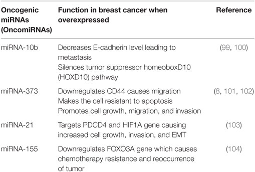 Oncogenic microRNAs (OncomiRNAs) dysregulation causes the onset of cancer. OncomiRs act as negative regulators of the tumor suppressor genes. The most screened miRNAs as prognostic markers of breast cancers are miRNA-10b, miRNA-21, miRNA-373, and miRNA-27a (20, 98). The summarized reviews on oncogenic miRNAs are presented in Table 1.