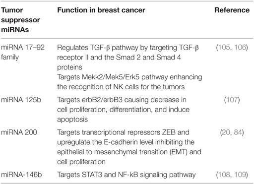 Table 2. The summary of tumor suppressor miRNAs reported in literature.