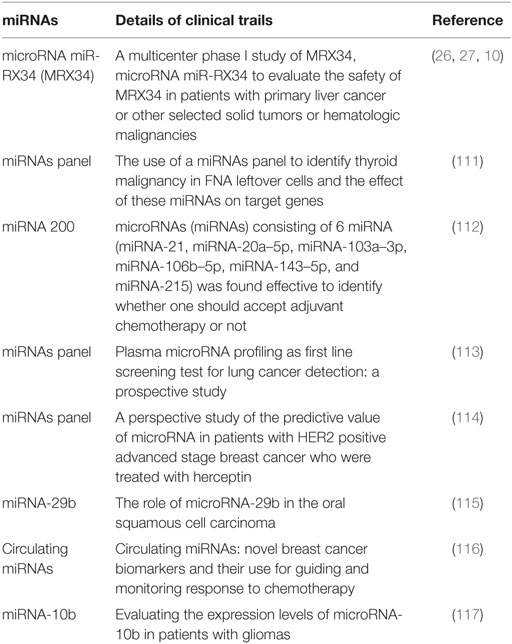 Table 3. List of miRNAs and their status on clinical trails.