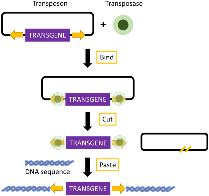 Figure 2. Mechanism of transposon-based insertional mutagenesis. The transposon system is composed of a transposon (targeted sequence of DNA) and an enzyme (transposase). The transposase binds to the appropriate site along the transposon and excises the transposon. It then pastes the transposon at an appropriate location in another DNA sequence, TA site in the case of Sleeping Beauty, and a TTAA site in the case of PiggyBac.