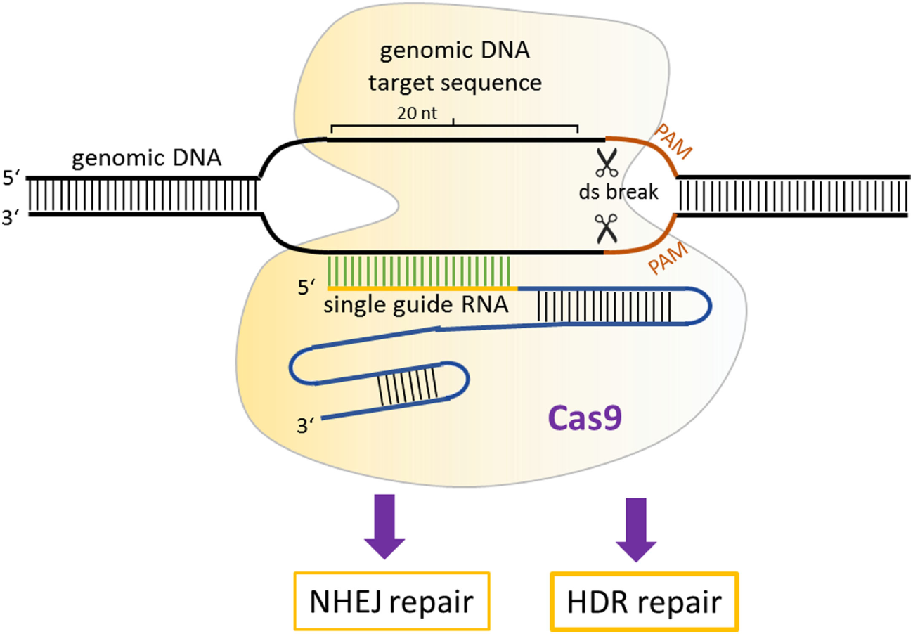Figure 3. Mechanism of CRISPR/Cas9 gene modulation. A single guide RNA directs Cas9 nuclease to a genomic locus, where it cuts the target sequence in the presence of protospacer-adjacent motif. The resulting double-stranded breaks stimulates DNA repair, which can occur via non-homologous end-joining or homology-directed repair-mediated repair.