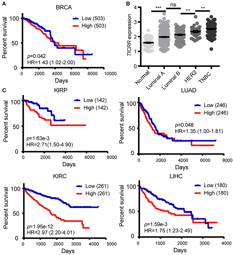 Figure 9. Association of TICRR expression with clinical outcomes. (A) Kaplan-Meier survival analysis was conducted between TICRR expression and overall survival of patients with BRCA using the web-tool OncoLnc. (B) Patients with different subtypes of breast cancer showed different expression levels of TICRR [log10(1 + FPKM)]. Luminal A, ER/PR-positive and HER2-negative; luminal B, ER/PR-positive and HER2-positve; HER2, ER/PR-negative and HER2-positve; TNBC, ER/PR-negative and HER2-negative. **p < 0.01, ***p < 1.00 ×10−3, one-way ANOVA test. Results were displayed as means ± SEM. (C) Kaplan-Meier survival analysis was performed between TICRR expression and overall survival of patients with KIRC, KIRP, LIHC, and LUAD. Median of TICRR mRNA expression was used to group and p-value was calculated using log-rank tests. HR, Hazard Ratio.