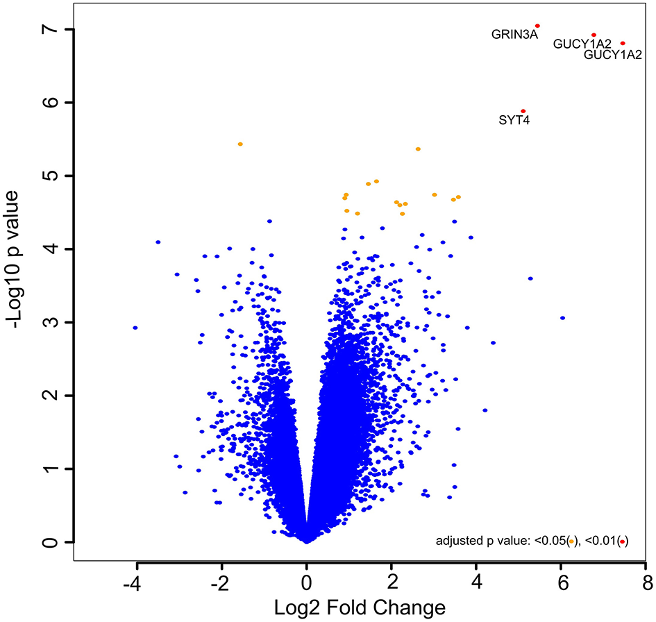 Volcano plot of –log10 (p values) vs. log2 fold change. The –log10 (p values) represents the level of significance of each gene while log2 fold change represents the difference between the levels of expression for each gene between the castration-induced regression nadir and castration-resistant regrowth groups.