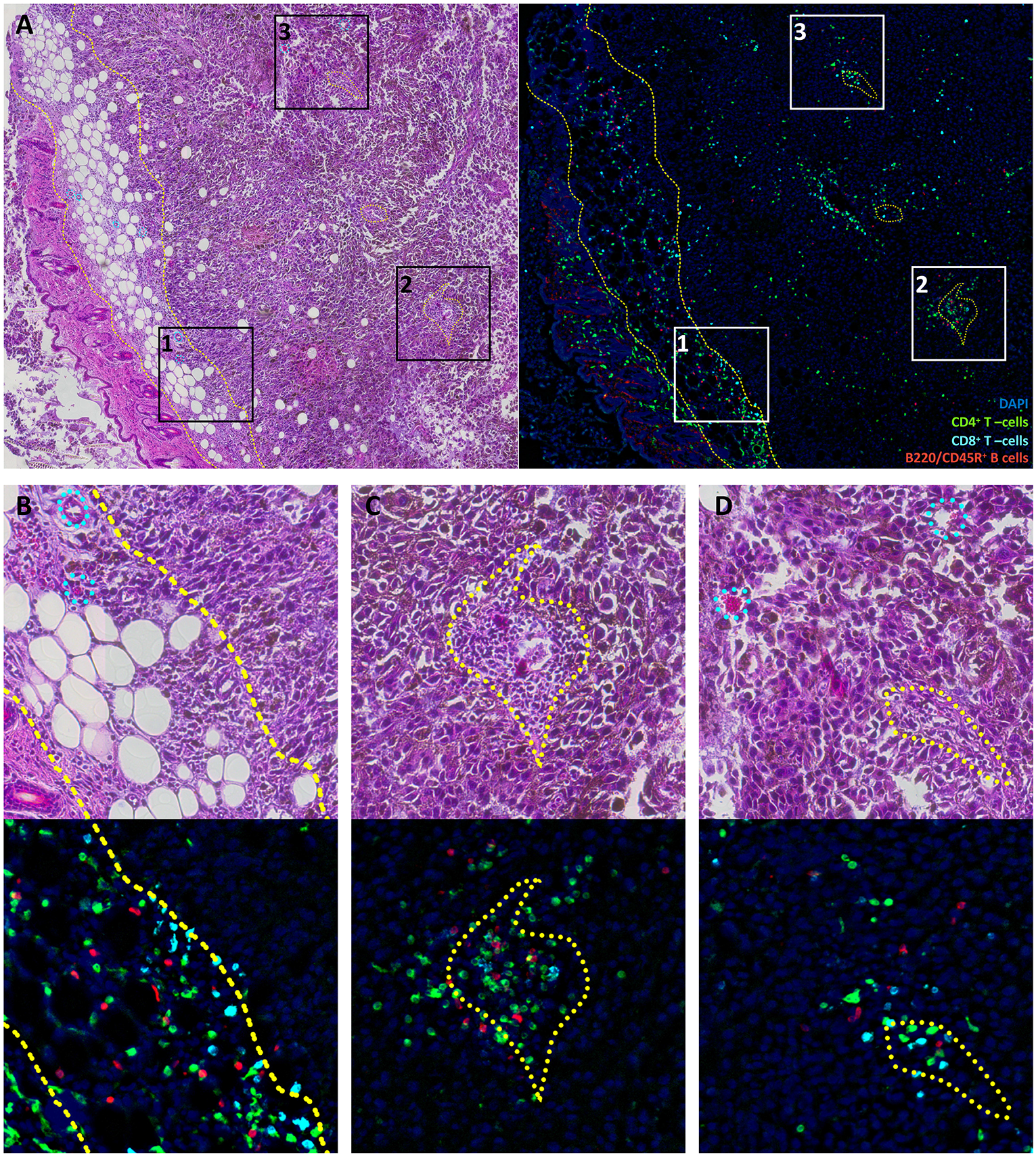 Lymphocyte distribution in B16F0 mouse melanoma. (A) Overview image of the tumor and surrounding tissue labeled with H&E staining (left) or multicolor immunofluorescence (right). (B–D) show close-up of rectangles 1, 2, and 3 from panel (A). Green represents CD4+ T cells, cyan represents CD8+ T cells, red represents B220/CD45R+ B cells and blue indicates DAPI-stained nuclei. Yellow dashed curves outline subcutaneous fibrous tissue that constitutes the tumor capsule. Yellow dotted curves outline regions that surround vessel and are enriched in leukocytes. Cyan dotted curves on H&E images show blood vessels and capillaries that have no prominent leukocyte pockets. It should be noted that tissue structures are marked based on H&E images; these marks do not coincide directly with cells in the fluorescence images since these show different slices spaced ~20 μm apart.