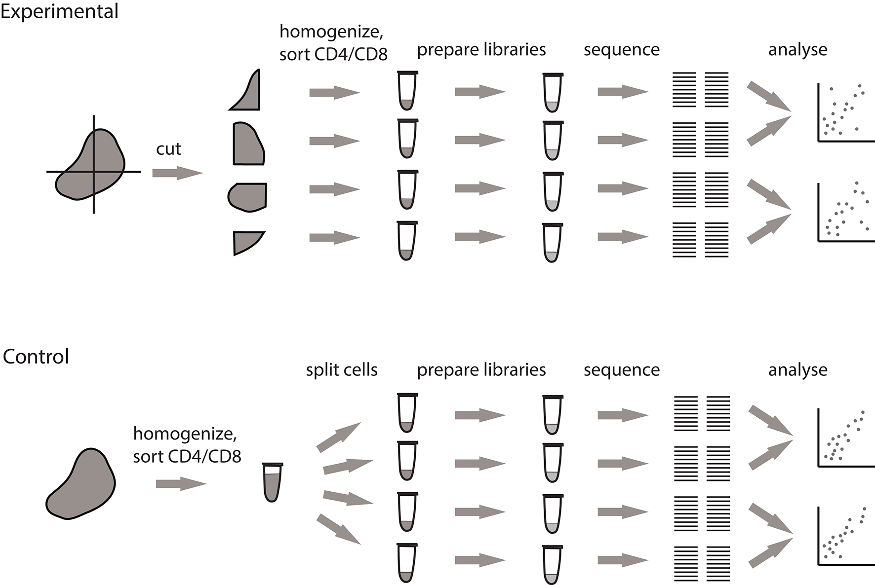 Pipeline for measuring the extent of local intratumoral T cell expansions. Control samples are generated by splitting the replicas at the level of single-cell suspension. Experimental samples are split at the level of tissue fragments.