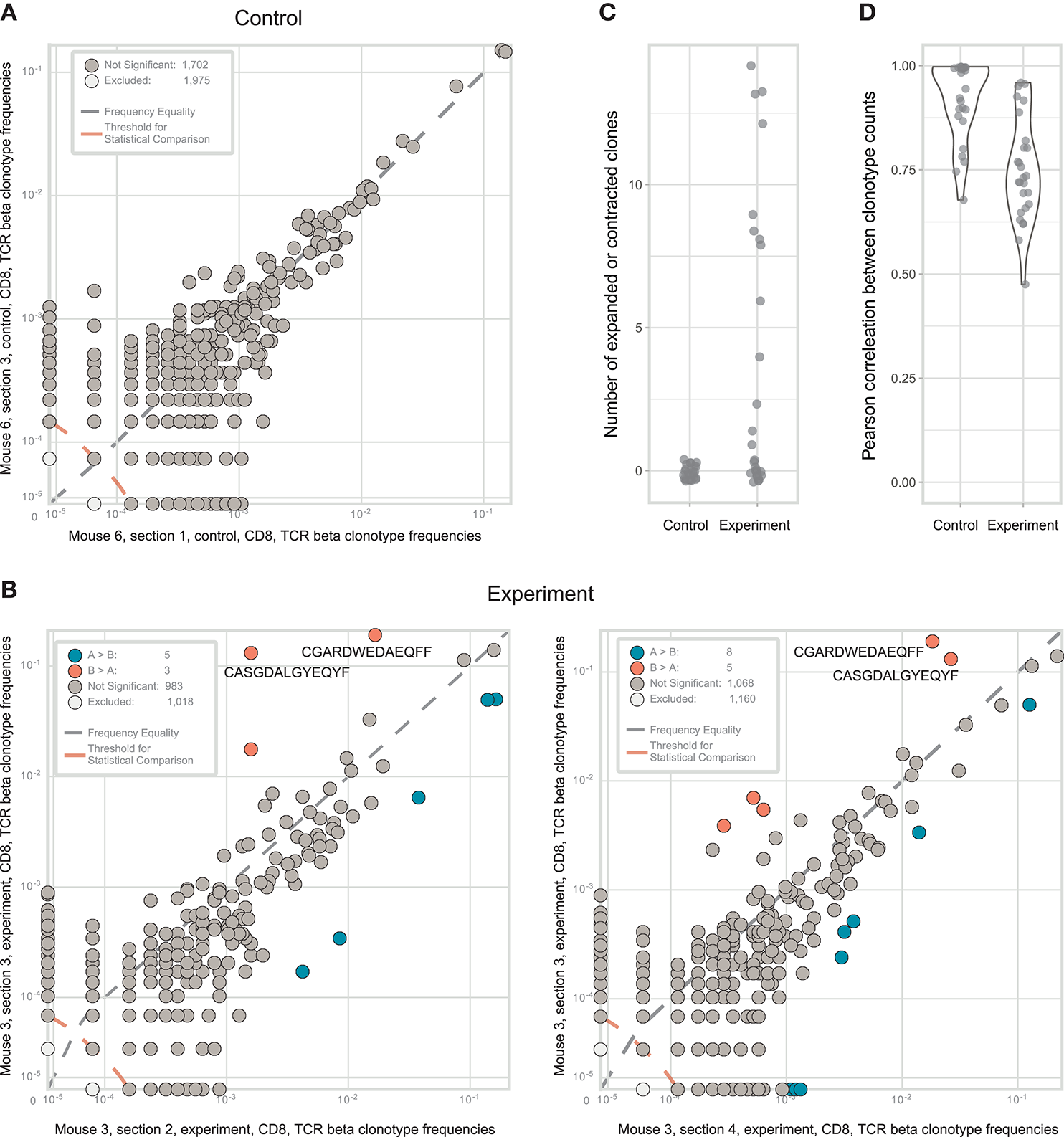 Identification of CD8+ T cell clones heterogeneously distributed within tumor samples from a mouse model of melanoma. (A). The concentration of each TCRβ CDR3 clonotype in the first control sample is plotted against the concentration of the same clonotype in the second control sample. (B). The concentration of each TCRβ CDR3 clonotype in tumor section #3 (y-axis) is plotted against the concentration of the same TCR clonotype in tumor sections #2 and #4 (x-axis). Clonotype variants that were identified as significantly expanded in one of the tumor sections are shown in orange or blue. (C). Numbers of expanded or contracted clones between all pairs of repertoires in four experimental and three control tumor. (D). Pearson's r measurement of correlation between counts of clones present in each pair of control or experimental repertoires.