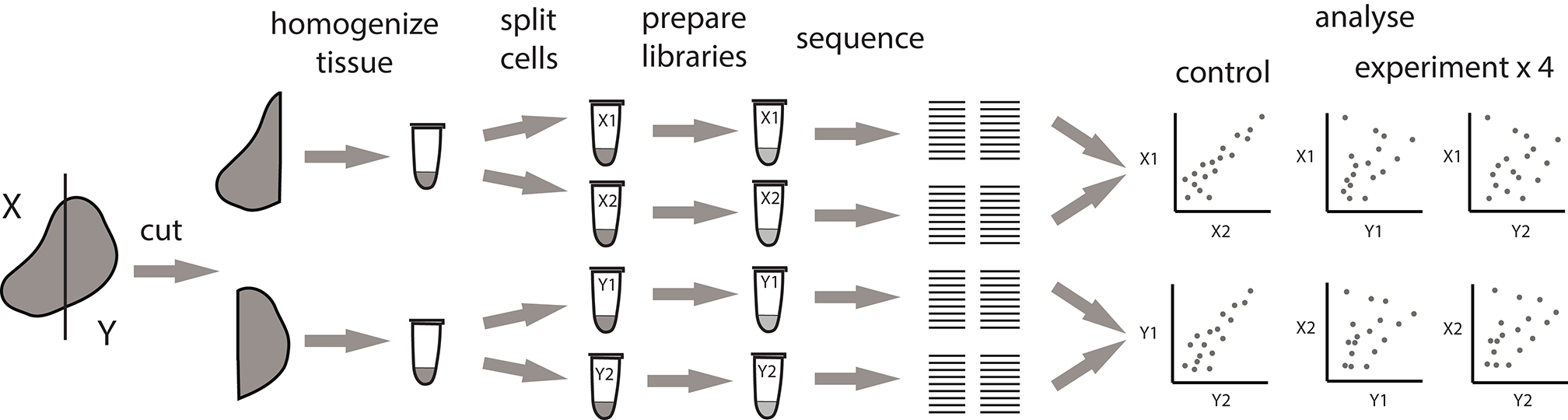 Alternative pipeline for measuring the extent of local intratumoral expansions. Experimental samples are split at the level tissue fragments. Each experimental fragment is further split into replicas at the level of single-cell suspension.